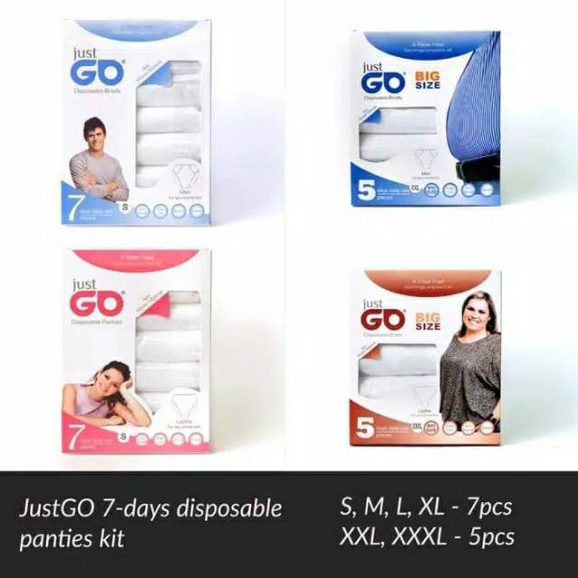 --- DISPOSABLE PANTIES JUST GO ---Solusi ternyaman untuk pria dan wanita aktif, terbuat dari bahan yang higienis. Celana dalam sekali pakai ini cocok untuk semua jenis kulit.Dapat digunakan untuk pemakaian sehari-hari, rumah sakit, olahraga dan spa, juga cocok untuk bepergian juga ibadah haji dan umrah.* HAJI* UMROH* RUMAHSAKIT* SPA* SALON* MASSAGE / PIJAT* TRAVELINGWarna : PUTIHTersedia untuk Laki-laki dan Perempuan dengan ukuran :- S = size 24-26 (isi 7 pcs)- M = size 27-29 (isi 7 pcs)- L = size 30-32 (isi 7 pcs)- XL = size 33-35 (isi 7 pcs)- XXL = size 36-38 (isi 5 pcs)- XXXL = size 39-41 (isi 5pcs) Estimasi Ukuran Pinggul : - S : 90 - 96 (cm)- M : 96 - 102 (cm) - L : 102 - 108 (cm) - XL : 108 - 114 (cm) - XXL : 114 - 120 (cm)- XXXL : 120 - 126 (cm)Happy Shopping ;)#celana #celanamurah #celanakertas #celanadalam #celanadalamwanita #celanadalammurah #celanasekalipakai #murah #celanadalampria #haji #hajiumroh #umroh #umrah #dans #danshouse #tok
