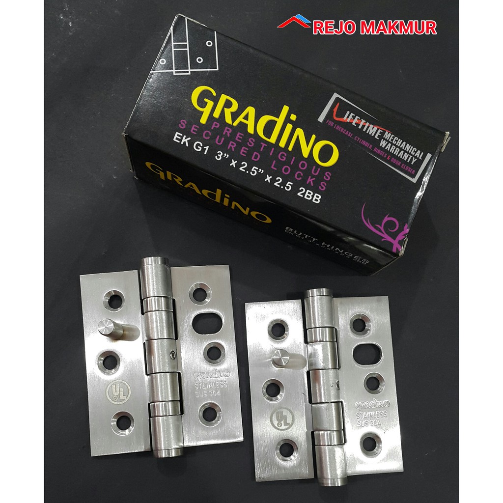 Engsel Gradino memiliki kadar stainless tinggi, dapat membuat engsel menjadi lebih tahan karatSpesifikasiUkuran : 3"x2.5"x2.5mm (tinggi 7,5cm dan lebar satu sisi 2,5cm)Stainless : SS 304Satuan : 1 Pasang (