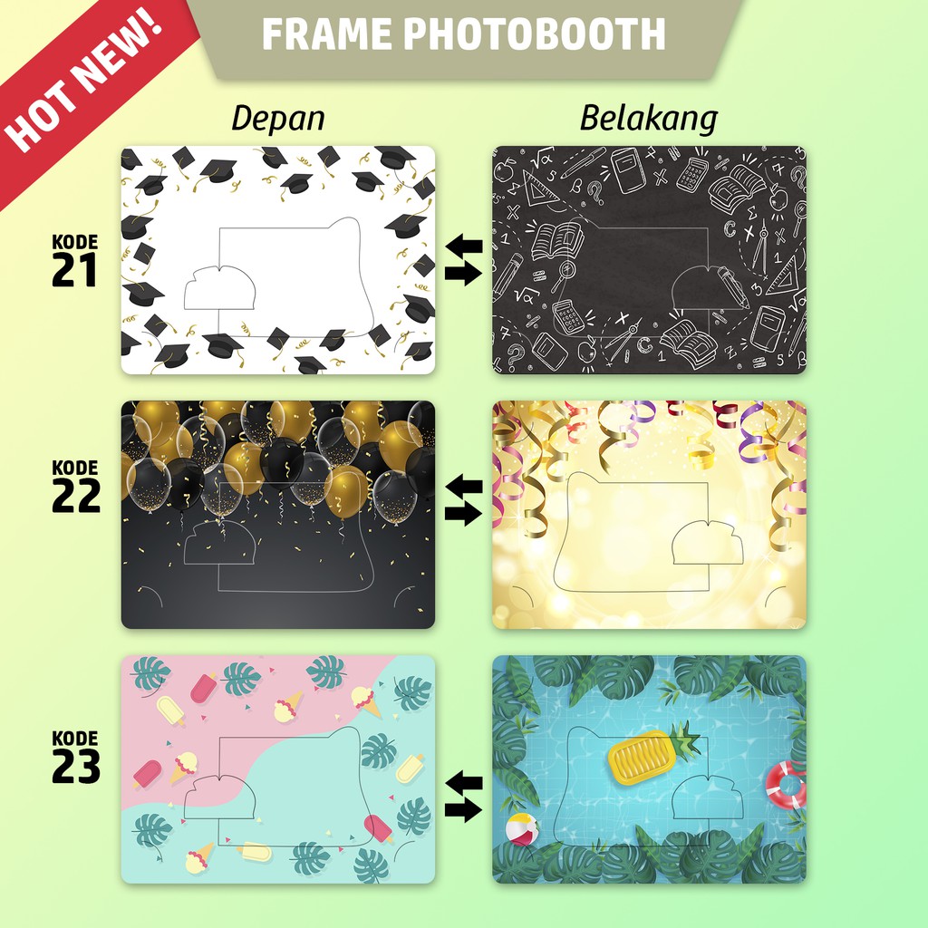 READY STOK! Frame Foto 4R Bahan Karton untuk Photo booth kamu.MURAH dijamin!!!Spesifikasi frame photo booth :1. Bahan art carton tebal 310 gr2. Ukuran frame foto 13 x18 cm3. Tipe frame selembar (tidak lipat)4. Dudukan frame bisa potrait dan landscape5. Disain depan belakang.6. Min pembelian 100pcs7. Harap cantumkan kode barangMesin yang kami gunankan adalah mesin offset 4 warna heidelberg kualitas cetak tak perlu diragukan.=========================================================================Kami juga menerima cetak frame untuk photo booth kamu menggunakan desain sendiri.Syarat dan ketentuan cetak frame menggunakan disain sendiri :1. Minim order 500pcs untuk 1 disain (depan Dan belakang). - Harga 500 pcs @ Rp 650.000- Harga 1000 pcs @Rp 800/pcs = Rp 800.0002. Kirim disain ukuran 18x13cm ke email format (jpg, PSD, atau PDF).3. Pengerjaan 3-5 hari.4. Pengiriman menggunakan JNE Note : silahkan tanyakan kepada kami terlebih dahulu untuk ketersedian frame stok.#framephotobooth #framekarton #framefoto #framephoto #framephoto